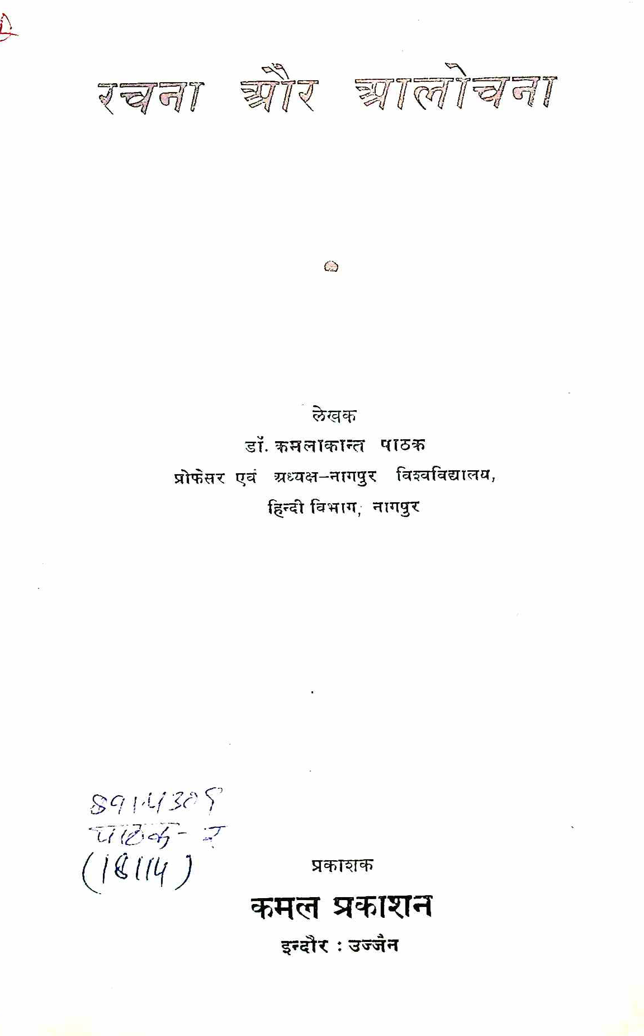 रचना और आलोचना -1 अतिरिक्त अंक समीक्षा पढ़िए बुक सूची देखें संस्करण संख्या : 001 मूल : इंदौर, भारत भाषा : हिंदी पृष्ठ : 176 सहयोगी : सरदार शहर पब्लिक लाइब्रेरी
